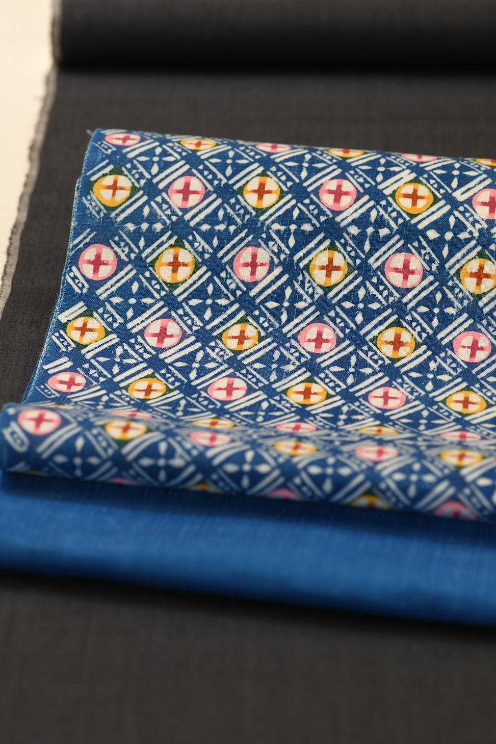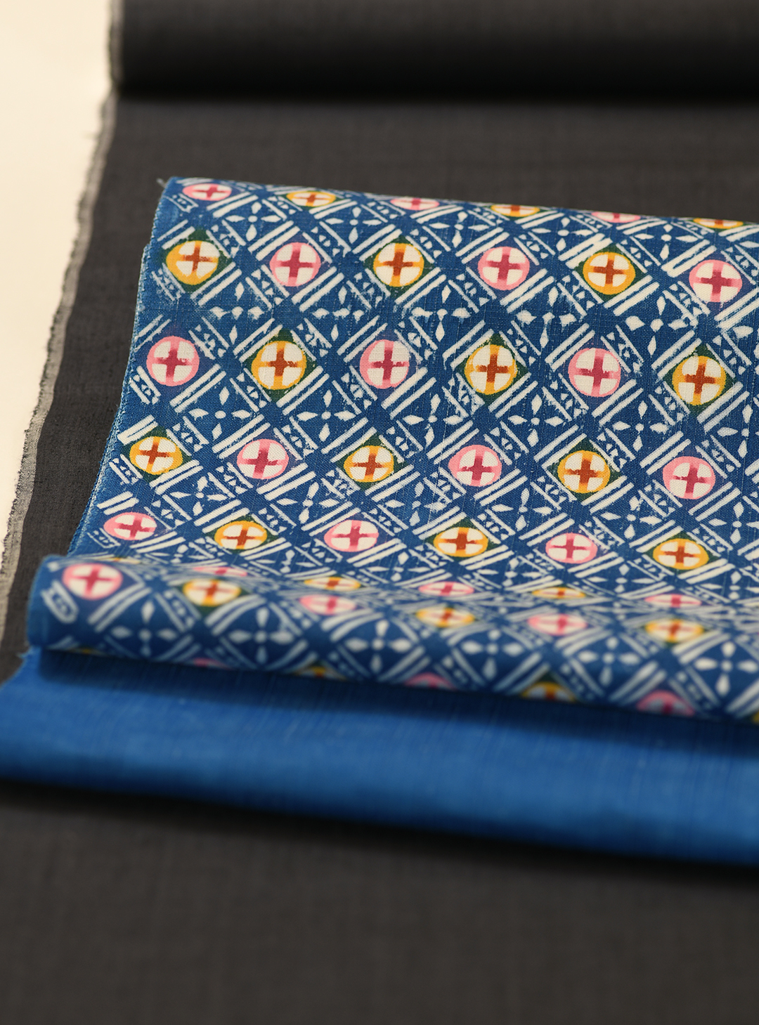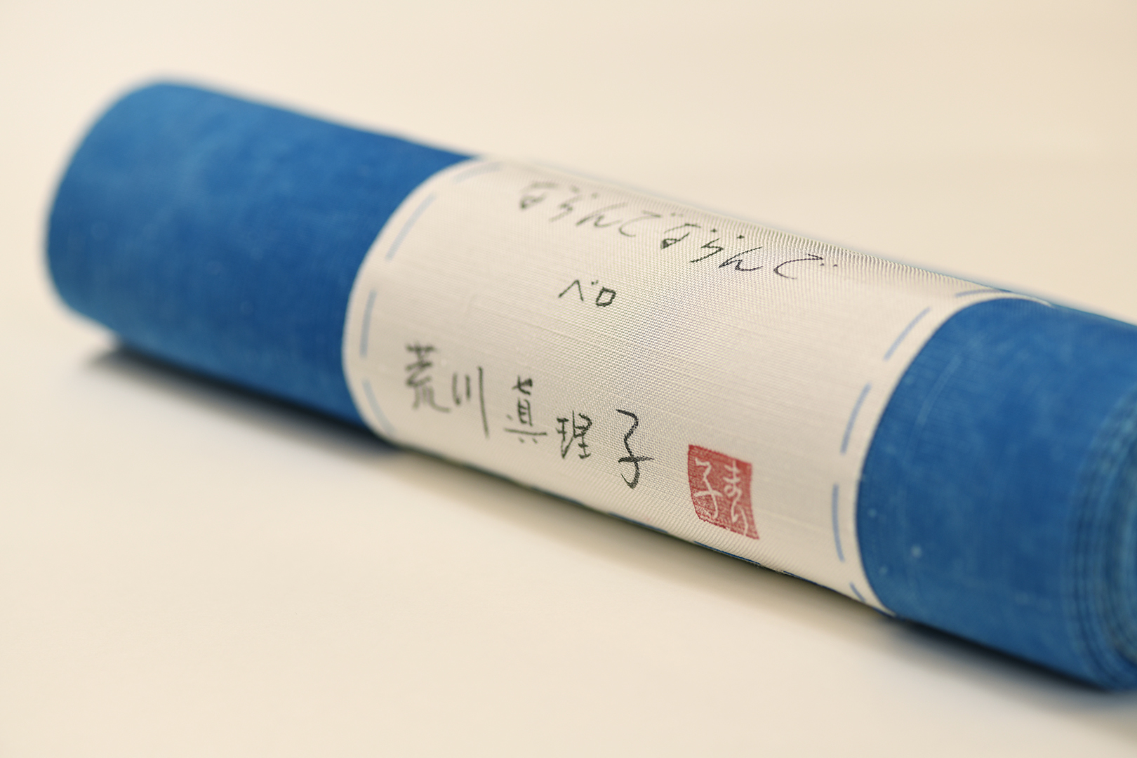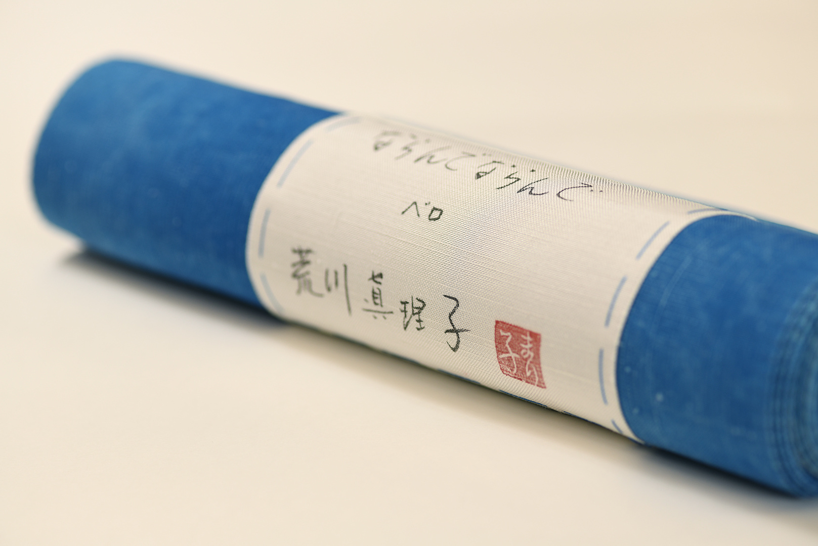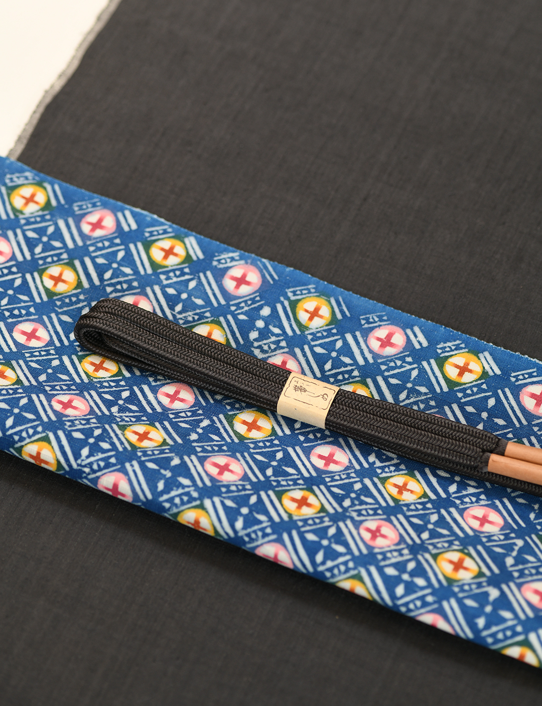 型絵染作家、荒川眞理子さんの九寸名古屋帯です。荒川さん初期のデザインの型を特別に染めていただきました。ご自身が型絵染作家になられるきっかけとなったと語る沖縄の古紅型の様な可愛らしいデザインと荒川さんならでは色使いが美しく、見ているだけでうきうきする様な作品です。この鮮やかなブルーを生み出しているのは「ベロ藍」という化学染料です。18世紀初頭にドイツ、ベルリンの染料業者が発見したこの染料は「ベルリン藍」を省略して「ベロ藍」と呼ばれ、日本では浮世絵師、歌川広重や葛飾北斎が好んで用いたことで知られています。経年変化を楽しみ、数年後の少し落ち着いたこの帯の色合いなどを想像しながら、お出かけを楽しんでいただけましたら幸いです。