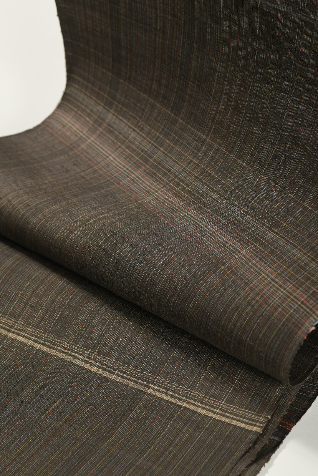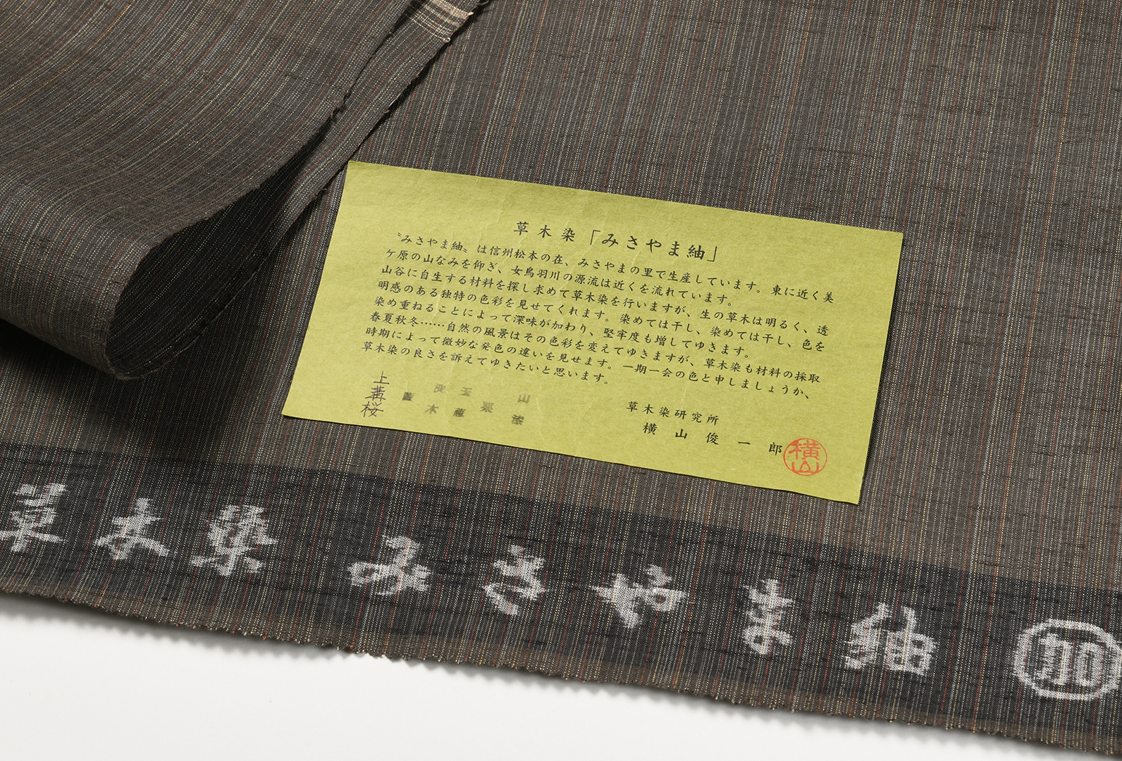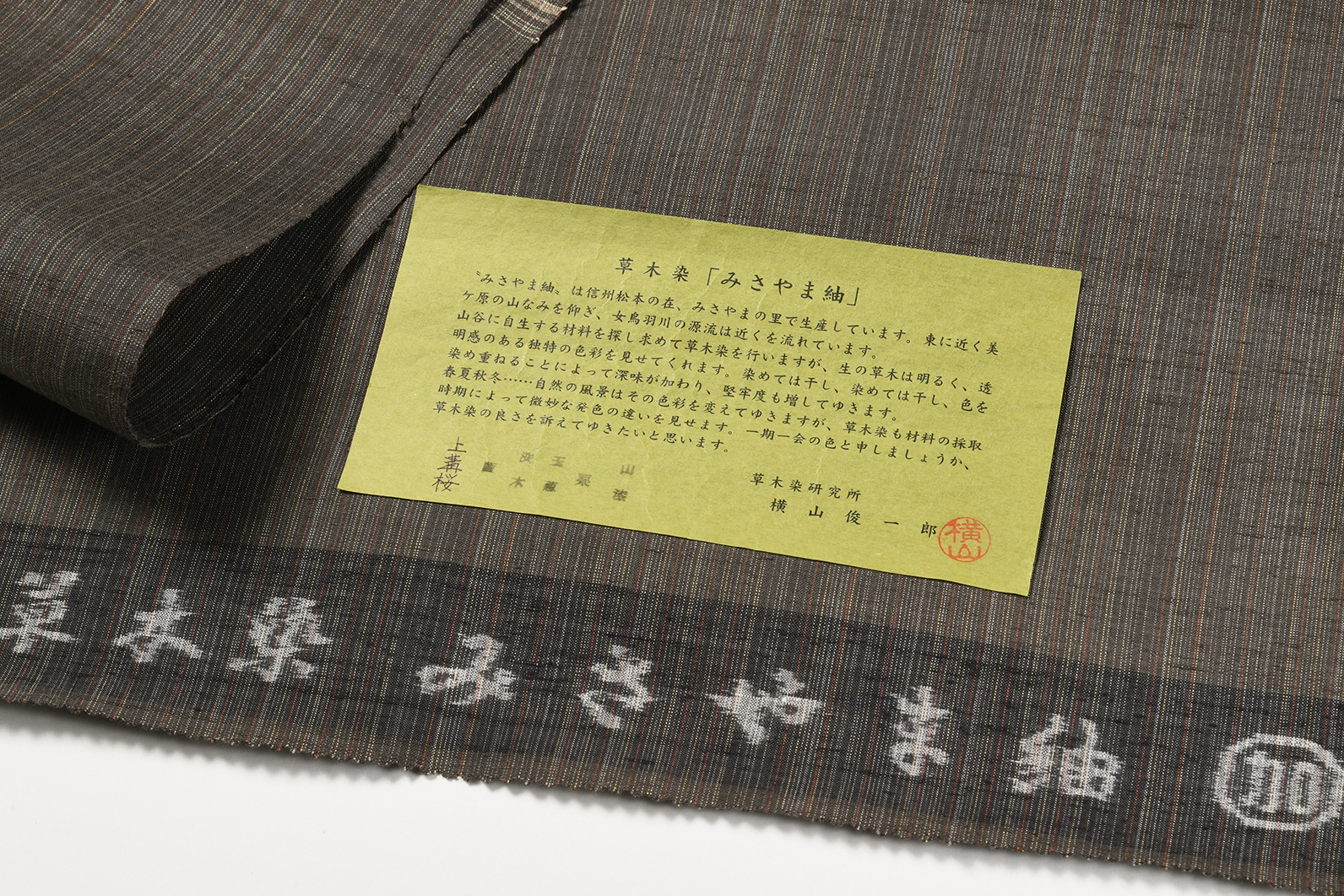 長野県三才山(みさやま)地方で草木染にこだわった紬の製作をしておられる横山俊一郎さんの「みさやま紬」です。染料となる草木は全て工房周辺の山谷に自生する植物です。横山さんはそれぞれの草木が時期によって微妙な発色の違いを見せることにまで着目し、各植物がもっともみずみずしく美しい発色を見せる時期に採集し、糸を染めます。媒染で使う灰汁を自ら藁を燃やして作るなど、横山さんのものづくりに対する真摯な姿勢は、自然や製作する品物に対する愛情や敬意を強く感じさせます。こちらの紬は山漆、栗、玉葱、渋木、藍、上溝桜を染料として用い、たくさんの色が縦、緯に交差している非常に味わい深いお品です。他に、色数の少ない比較的お値頃なお品物も在庫がございます。