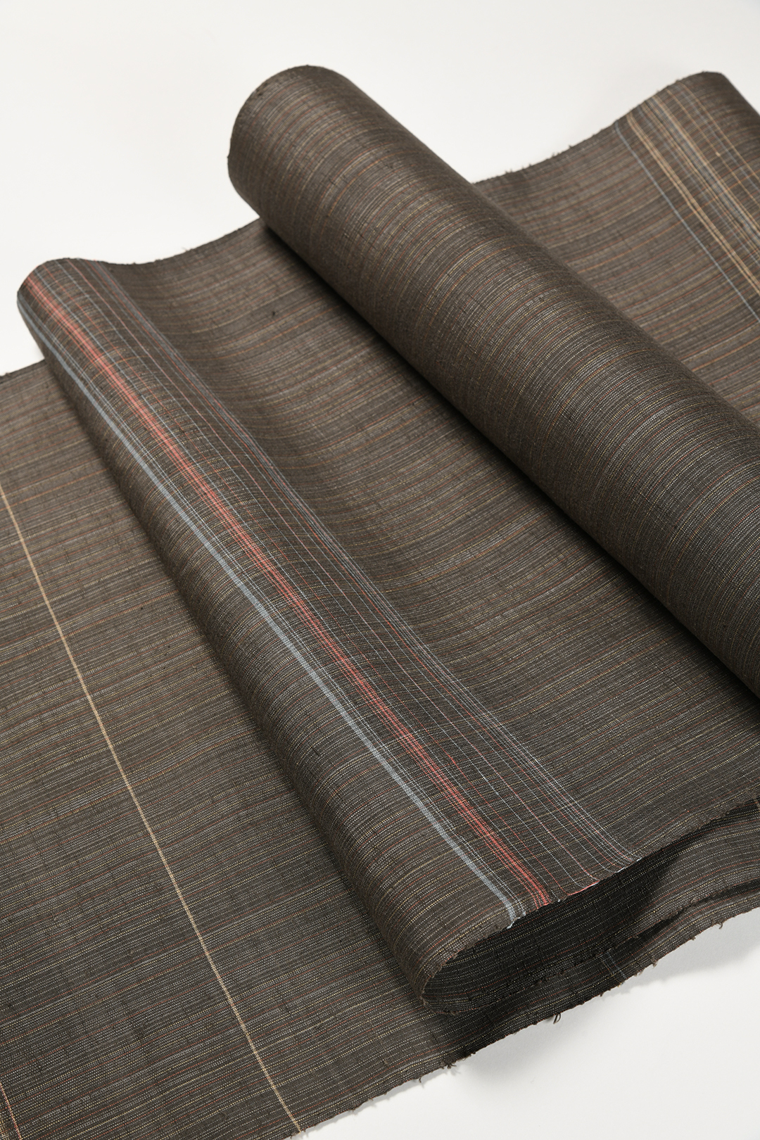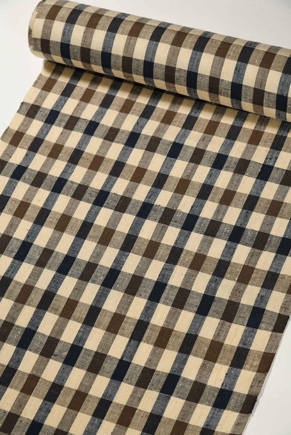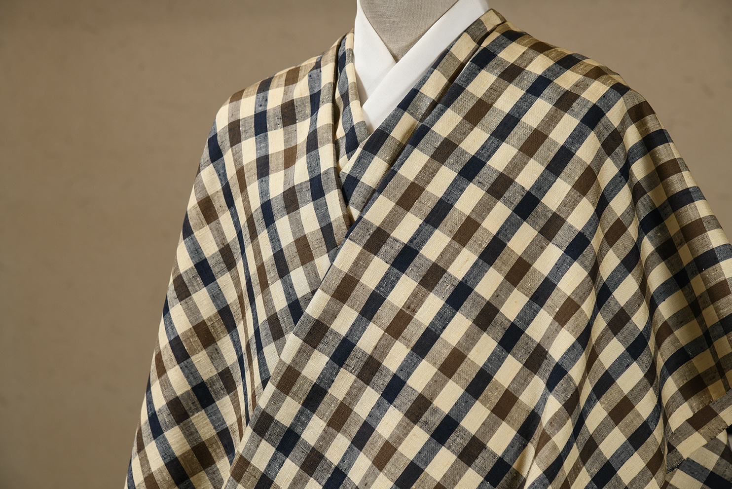 「士乎路」とは石川県能登地方の古い呼び名です。「結城紬」に負けない風合いと草木染などの天然染料による美しい色合いを求めて石川県出身の繊維研究者が開発・製作した士乎路紬は、手引きの真綿糸でしか表現することのできない上質な紬ならではの風合いが持ち味です。手引の真綿糸とは、繭玉をお湯につけ、綿状に伸ばし、出来た絹の綿(真綿)から改めて人の手で紡いだ糸のことです。通常の絹糸は蚕が吐いた糸の端から繭を解いていくことで均一な1本の糸になるのに対し、真綿糸は繊維が絡み合った真綿から糸を紡ぐ事によってふんわりと空気を含んだ糸になります。こちらの紬は車輪梅で染めた絶妙な海松茶(みるちゃ)色と藍色のコントラストが美しい大胆な格子柄で、真綿紬ならでは風合いがより一層引き立つ逸品です。