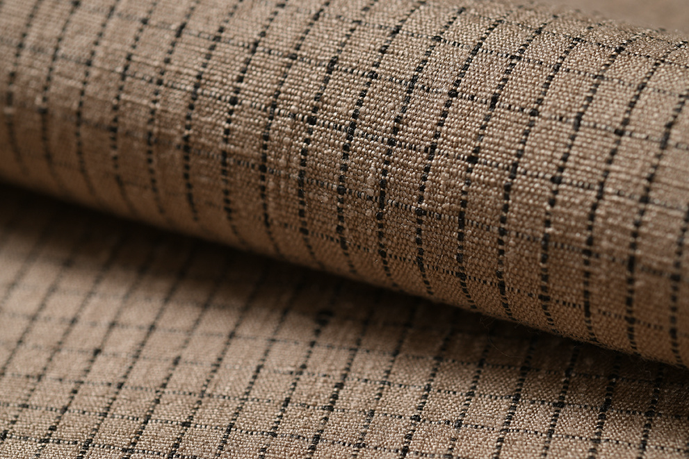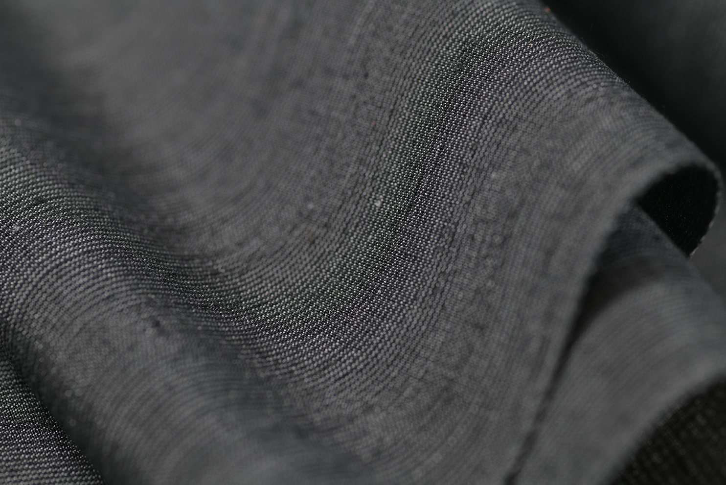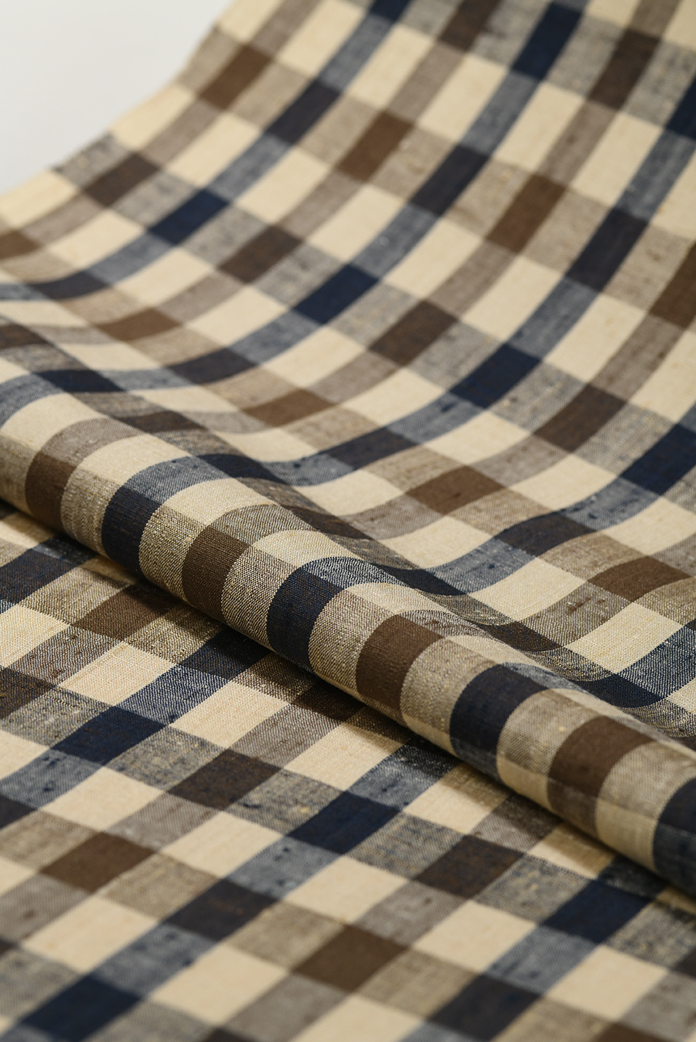 「士乎路」とは石川県能登地方の古い呼び名です。「結城紬」に負けない風合いと草木染などの天然染料による美しい色合いを求めて石川県出身の繊維研究者が開発・製作した士乎路紬は、手引きの真綿糸でしか表現することのできない上質な紬ならではの風合いが持ち味です。手引の真綿糸とは、繭玉をお湯につけ、綿状に伸ばし、出来た絹の綿(真綿)から改めて人の手で紡いだ糸のことです。通常の絹糸は蚕が吐いた糸の端から繭を解いていくことで均一な1本の糸になるのに対し、真綿糸は繊維が絡み合った真綿から糸を紡ぐ事によってふんわりと空気を含んだ糸になります。こちらの紬は車輪梅で染めた絶妙な海松茶(みるちゃ)色と藍色のコントラストが美しい大胆な格子柄で、真綿紬ならでは風合いがより一層引き立つ逸品です。