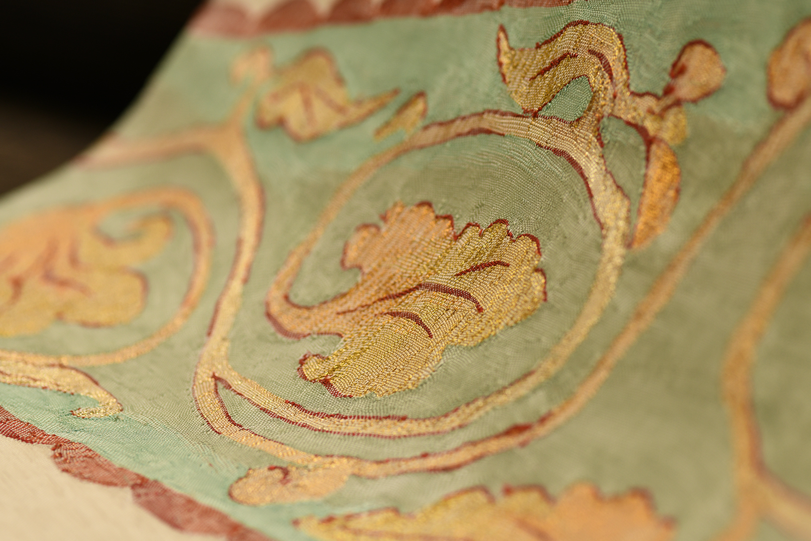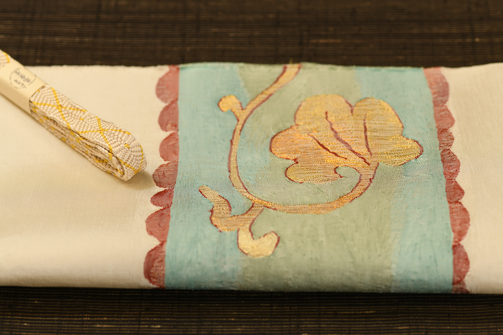 筆で描いたような濃淡を、細い糸を用いたすくい織(手織)で表現した西陣ならではの高い技術で製作された織名古屋帯です。デザインはアジア・中東の文様文化に造詣の深い「三風魯」ならではのもので、ややマットな質感の金彩に絶妙な青磁と朱、それぞれの濃淡がお互いに引き立て合う通好みな逸品です。付下、小紋などのセミフォーマルはもちろん、紬に合わせた上質な趣味のおしゃれ着としてもお楽しみいただきたい帯です。