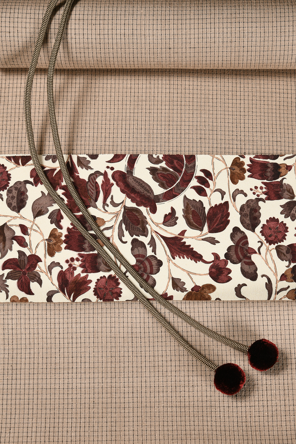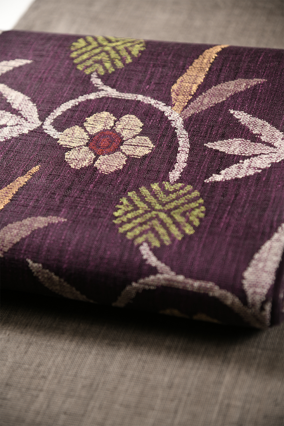 名物裂由来の笹蔓文が、絶妙な配色でのびやかに表現された工藝手織のしゃれ袋帯。糸質と手織の技術によるざっくりとした風合いが独特の存在感を出しています。結城など風合いの良い紬と合わせて、工藝的な味わいの着こなしをお楽しみください。