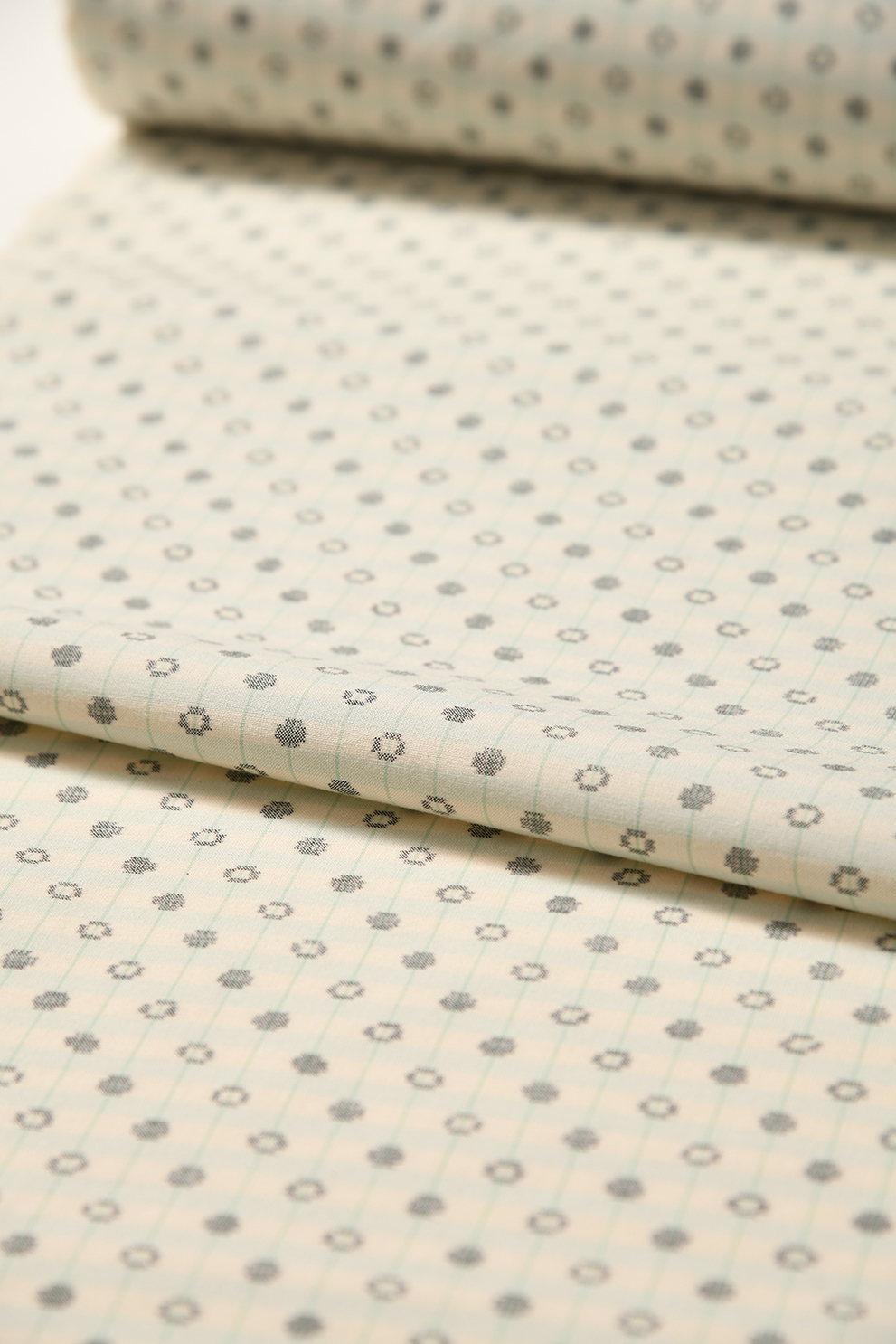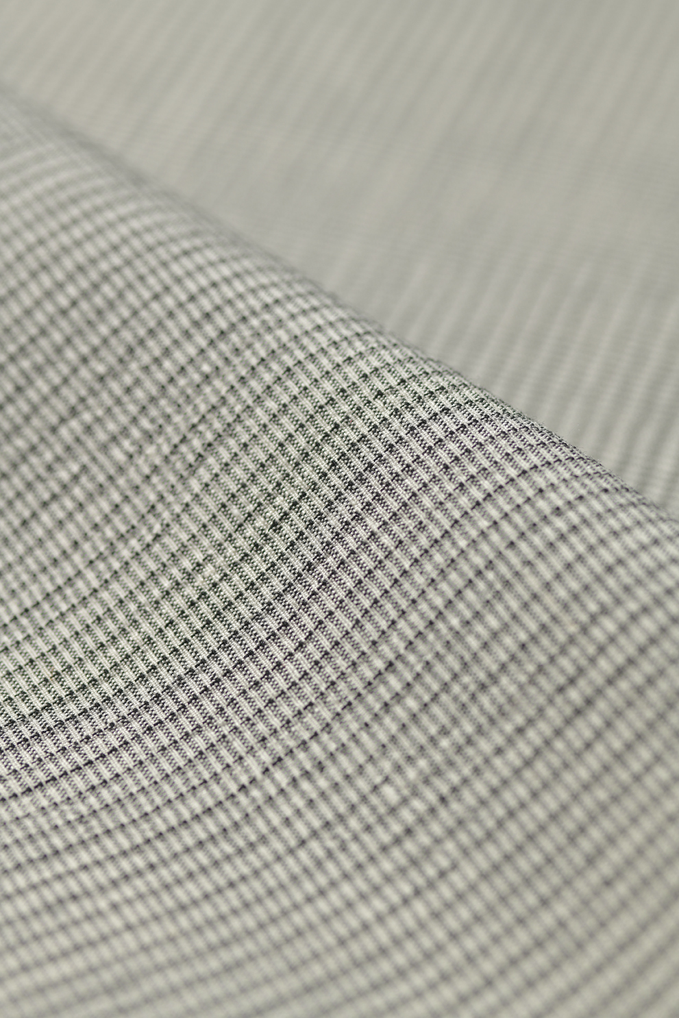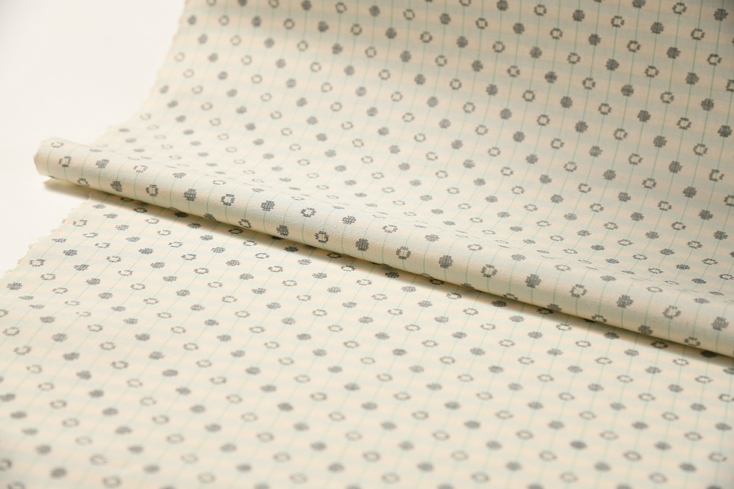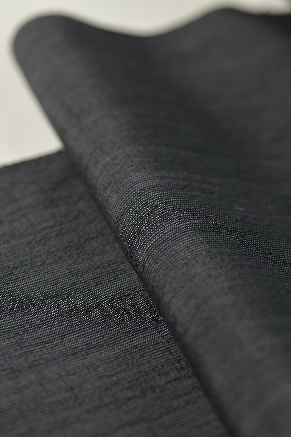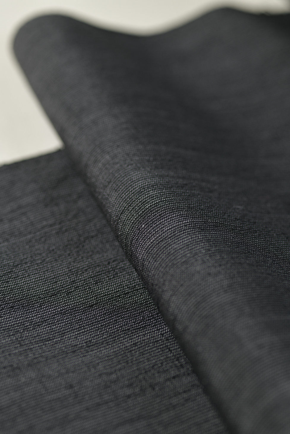 [着尺]綿入縮紬近年の気候に合った大変着心地の良さそうな単向きの紬です。経糸に絹、緯糸に綿の強撚糸と真綿糸を使用した、サラリとした肌触りの縮織です。多くの日本人が日常的に着物を身に付けていた時代にその丈夫さや着心地の良さから普段着として愛された豊田紬を前身として開発されたものと聞き、大変合点が行きました。