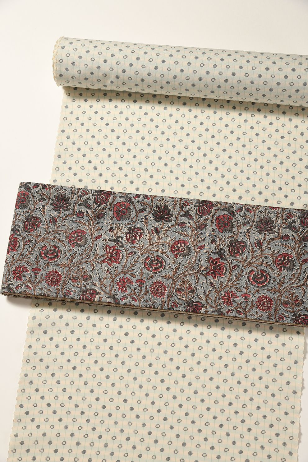 [帯]染九寸名古屋帯 真綿紬地摺型友禅 更紗(多ち花)柔らかな風合いの真綿紬地に型染めならではの優しい更紗柄がお洒落な京都の型摺友禅「多ち花」の名古屋帯。様々な風合いのお着物をさりげなく引き立てます。