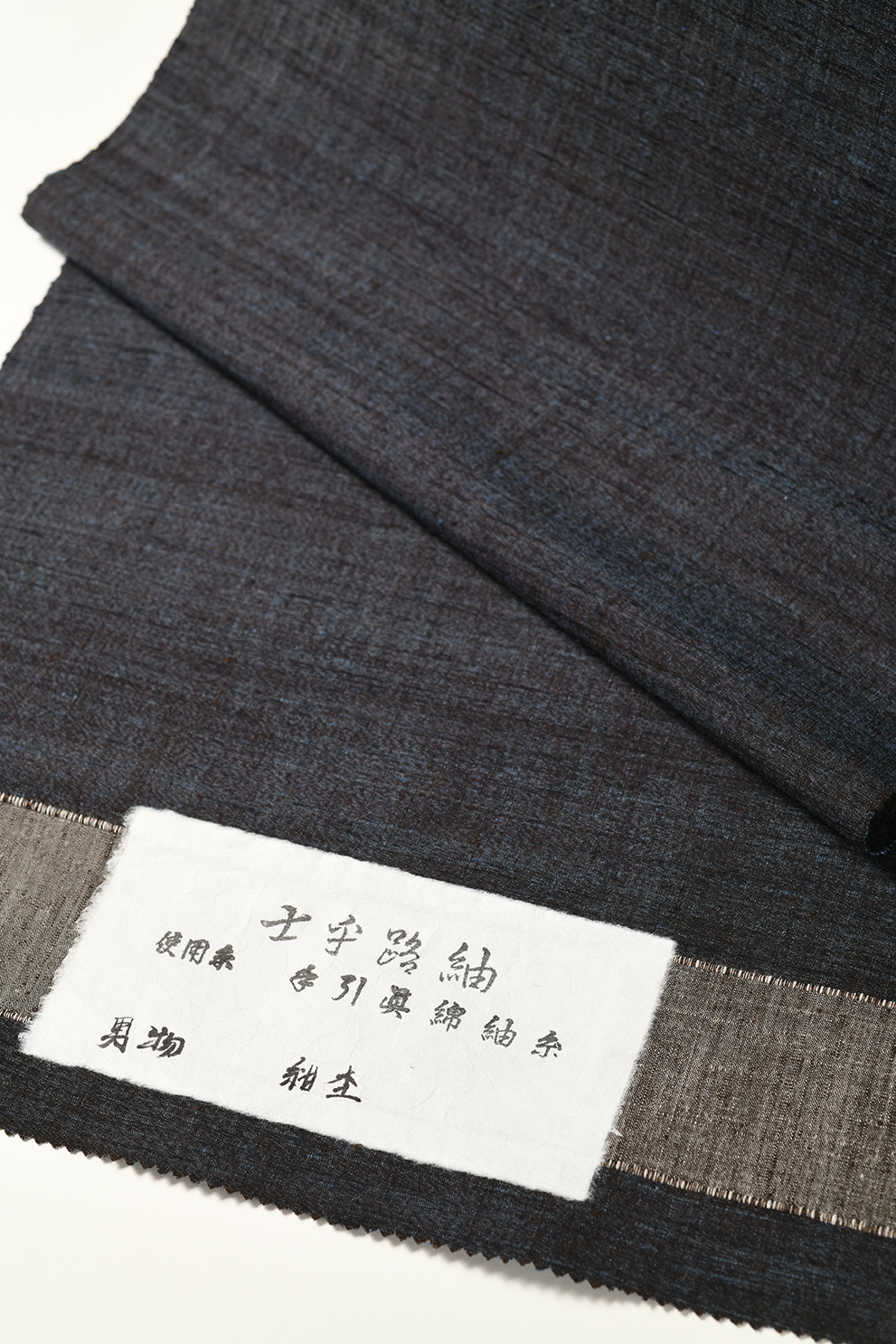 戦後、洗えて肌ざわりの良い「木綿」は粗雑に扱われていました。その「木綿」を大事に扱われる着物にしたい、との思いから長い歳月をかけて開発されたのが東郷織物の「綿薩摩」です。綿薩摩は大島紬と同じ技法によって作られますが、木綿は絹よりも色が染まりづらく、滑りが悪く織りにくいため、絹の大島紬より生産が困難になります。開発された綿薩摩はその肌ざわりや快適性、品質の高さに感動した武者小路実篤から「誠実無比」の賞賛を与えられました。現在では動力織機による「無地」や「みじん格子」など比較的お値頃なものから、手織による細かい「縦横絣」の最高級品まで、幅広い商品が作られています。こちらは、おしゃれな単衣向横絣の着尺です。