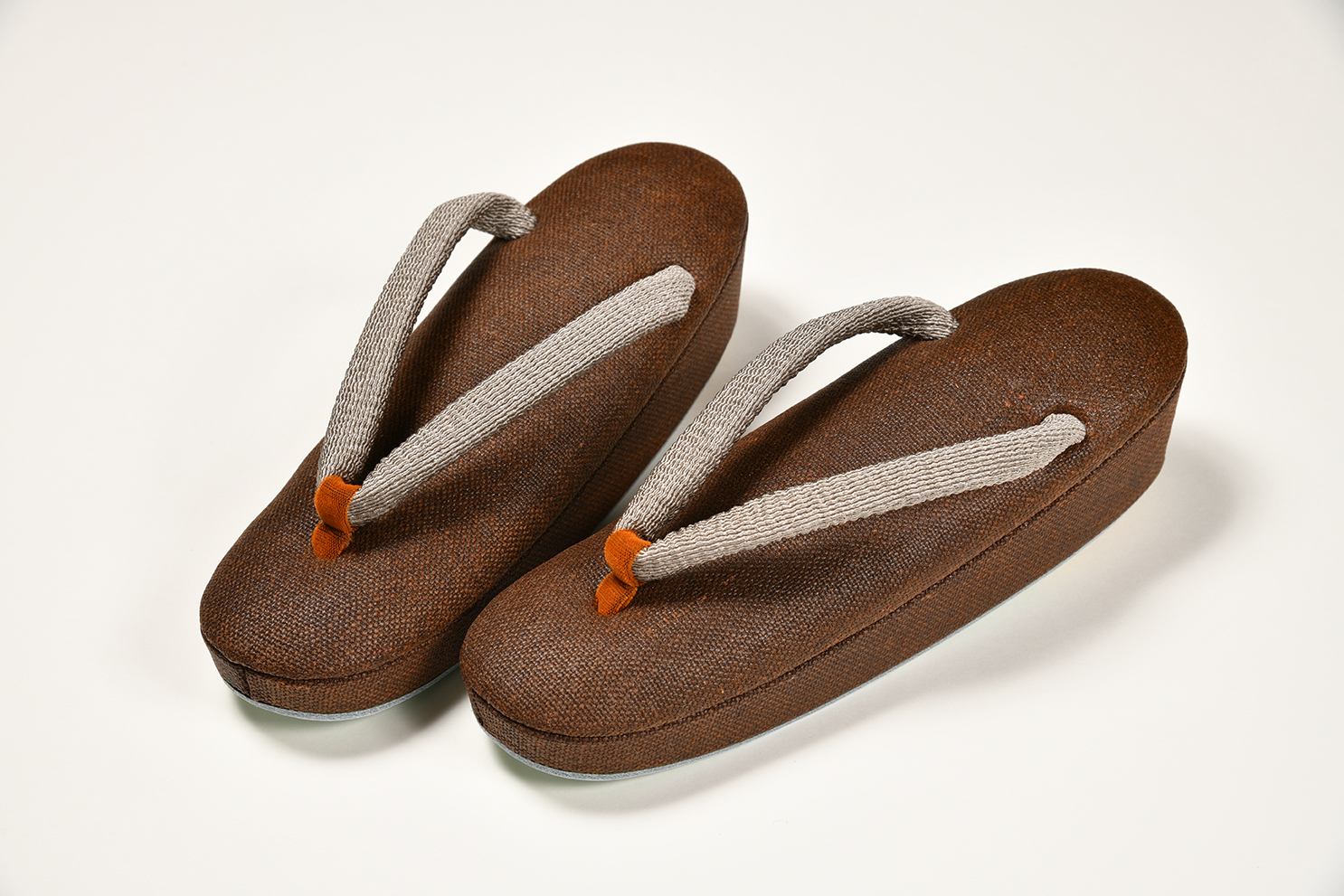 柿渋染めの酒袋地の草履です。柿渋染めの台は合わせる花緒が難しく、いつも悩むのですが、試作を重ねた花緒でしっくりとくるものができました。