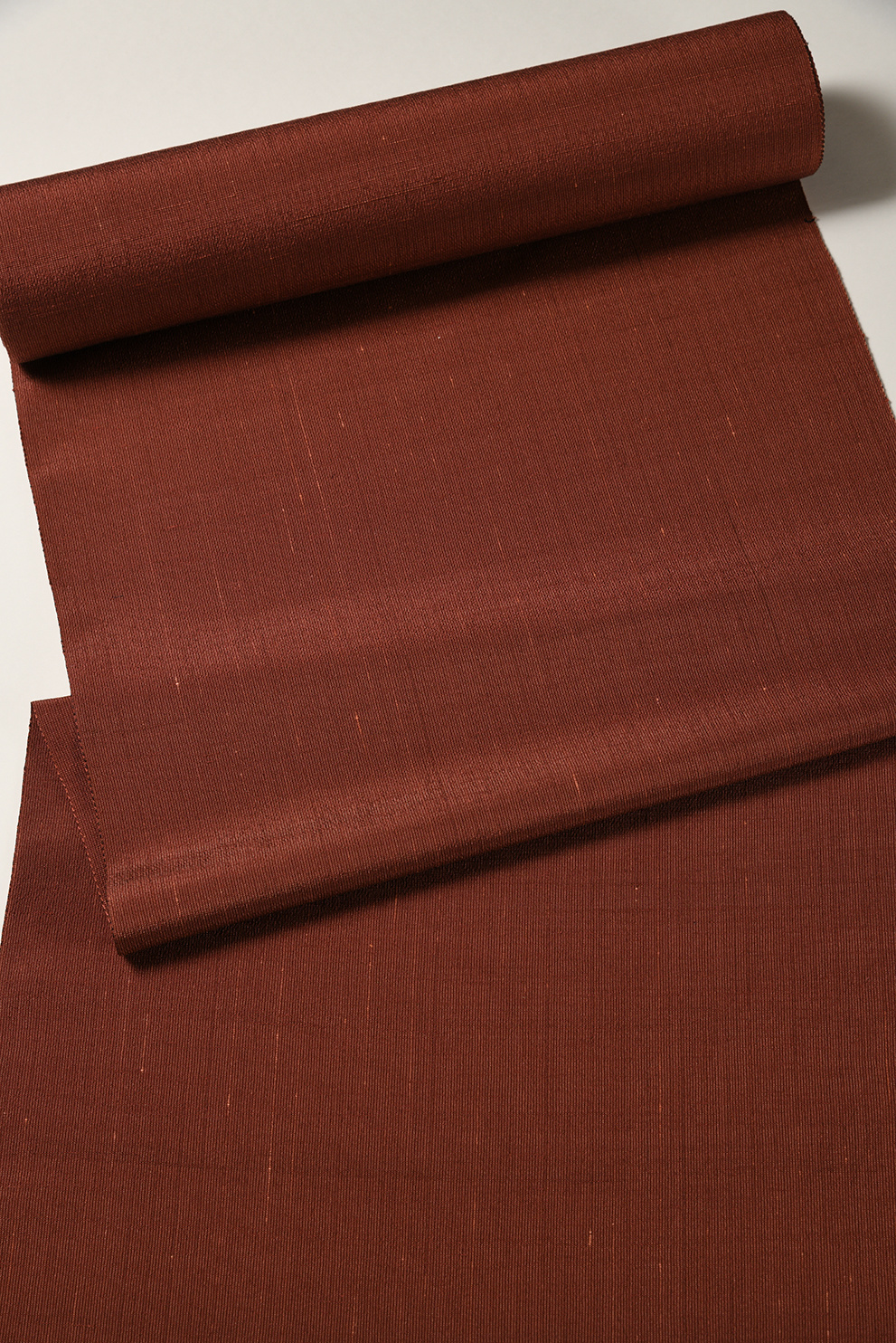 シックな煉瓦色がおしゃれな着物は、手引きの真綿糸を用い、結城紬にも劣らない風合いを持つ士乎路(しおじ)紬です。士乎路は、弊店でも何度もご紹介して参りました人気の紬でしたが、誠に残念ながら後継者不足から生産が終了してしまいました。こちらの品は、色、質感共に素晴らしく、即決して仕入れました。糸に撚りがかかっているので、単衣にもおすすめです。