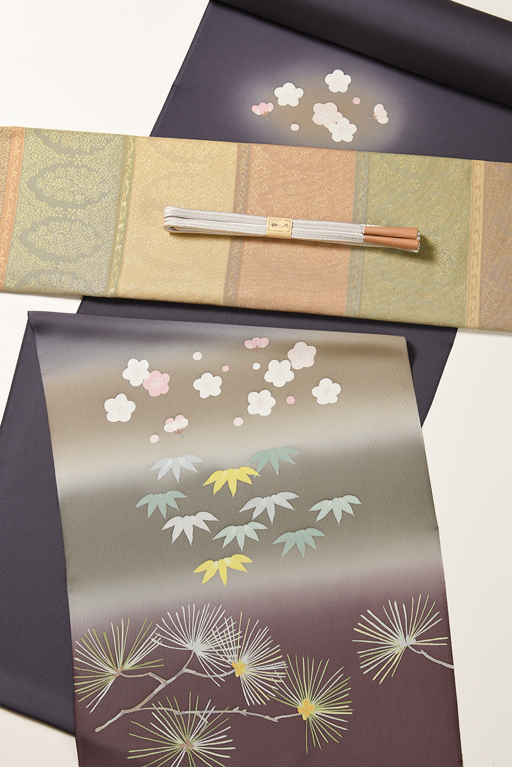 絶妙な配色の横段ぼかしに、ろうけつ染の松竹梅が何ともかわいいタッチで描かれた心惹かれる訪問着です。細やかな金糸使いが上品で垢抜けた西陣の袋帯を合わせました。お正月やおめでたいお席にぴったりの一揃えです。