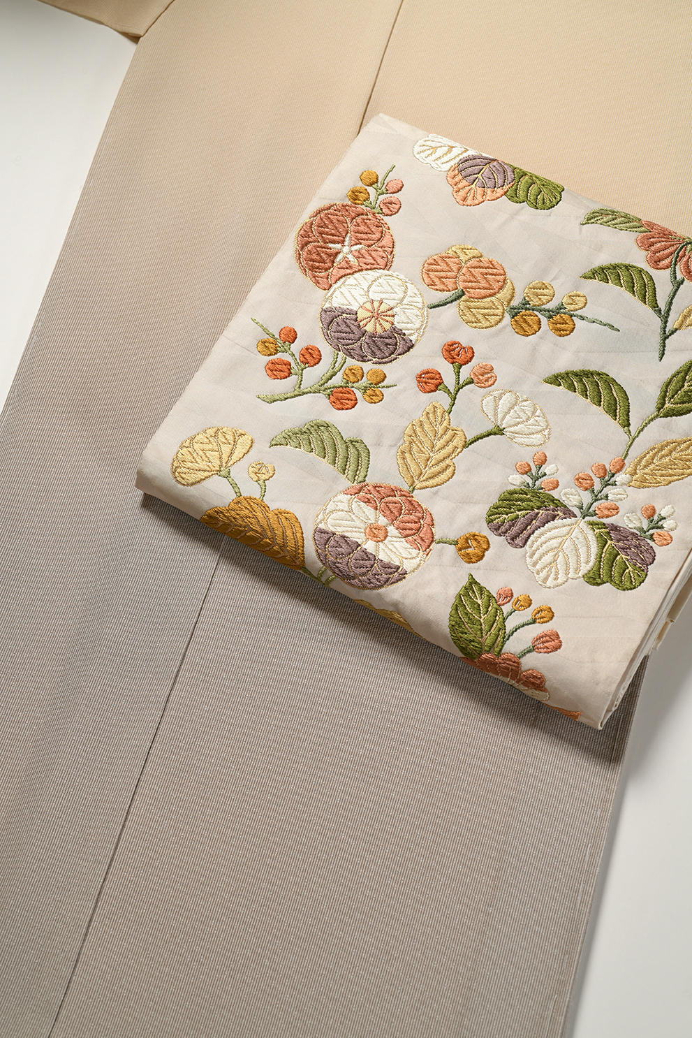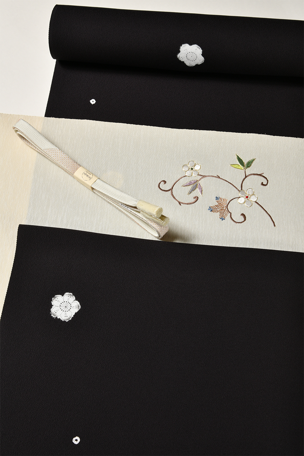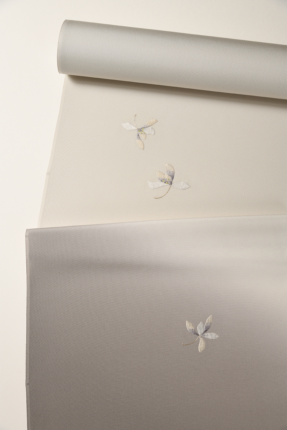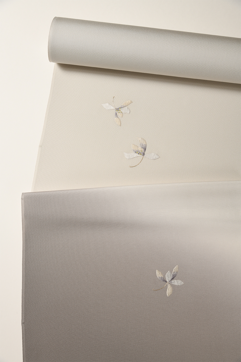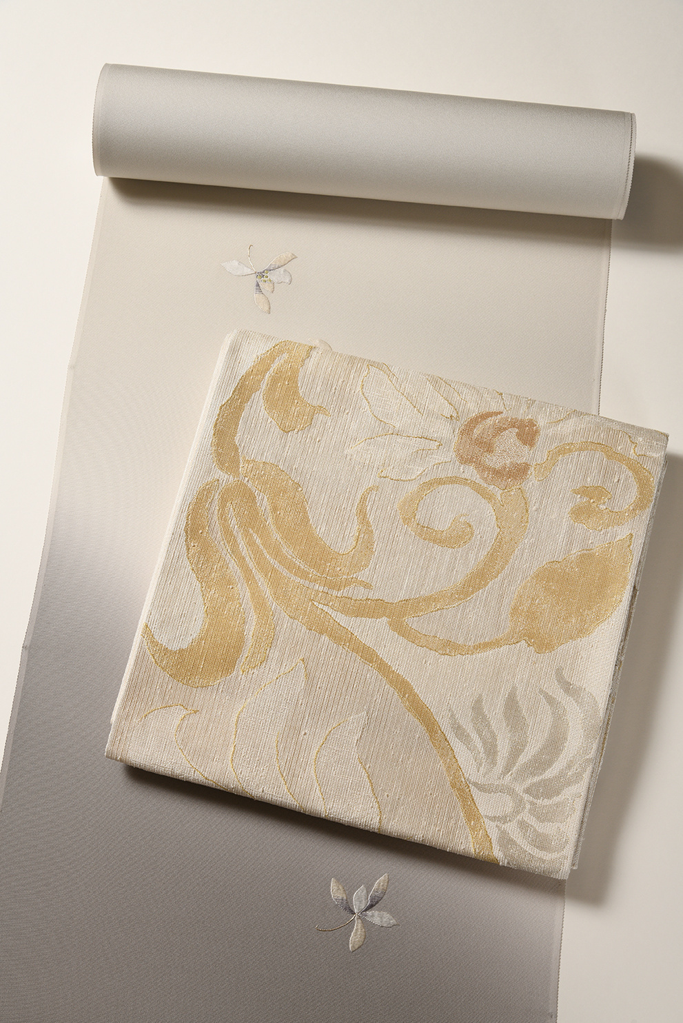 東西文明の混ざり合った文様文化の歴史とロマンを感じさせる楽浪唐花文を飛天錦のしゃれた質感で表現した洛風林の袋帯に、美しいグレーの濃淡で染めた付下の組み合わせです。付下のモチーフは春蘭で、糸の捻をかけずに刺した上質な刺繍の美しさも見所です。