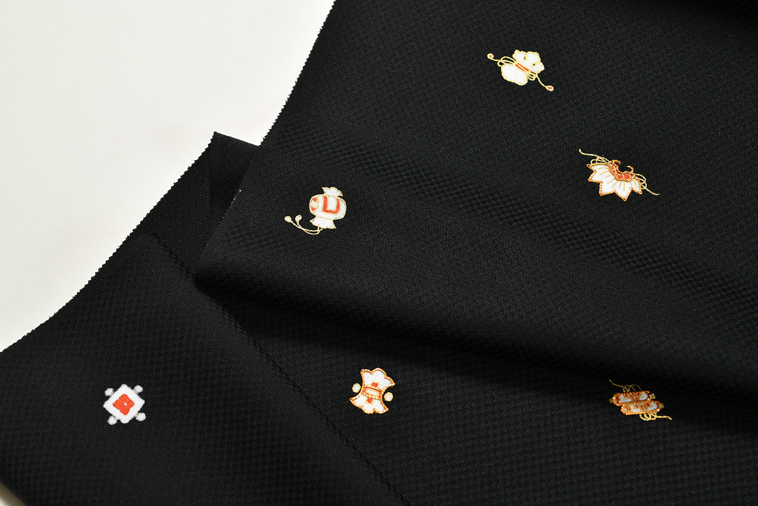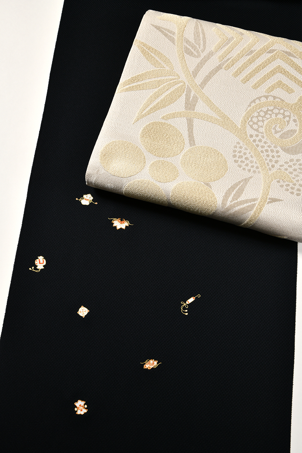 細かい市松模様の地紋のある黒地の生地に、白、金、朱赤の配色で、小さな宝尽くしの柄を散らしたお洒落な付下です。金彩の一部に金駒刺繍が施されているなど細部のこだわりと柄のサイズ感(あえて、絵柄がかなり小さめにデザインされています)が垢抜けた印象を与えます。写真2枚目では、千家十職塗師十三代中村宗哲監修のもと製作された大胆な笹蔓文様の袋帯を合わせて、大人の女性のコーディネートにしてみました。