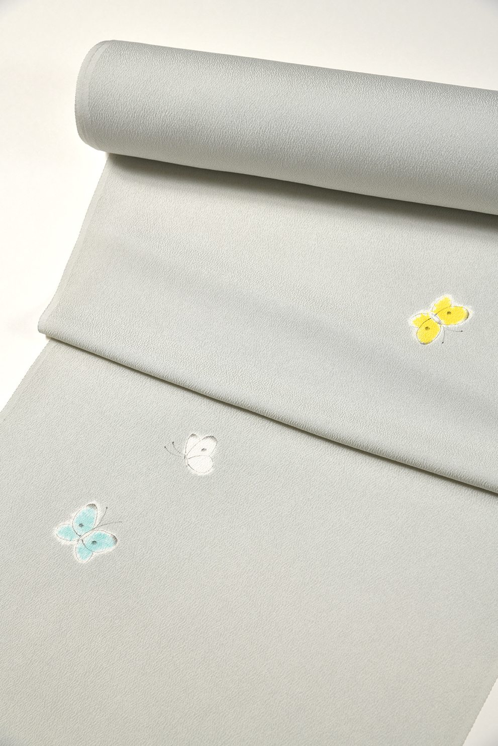 辻ヶ花ならではのやわらかな絞りの輪郭と繊細な筆描きの蝶が、のどかな雰囲気を感じさせる上品な春らしさを感じさせる贅沢な小紋です。絵本のような可愛らしさと大人のおしゃれを楽しめそうなニュアンスのある絶妙なグレーの地色のバランスが素敵です。どんな帯を合わせて出掛けようかと想像するだけで楽しくなるようなお着物です。