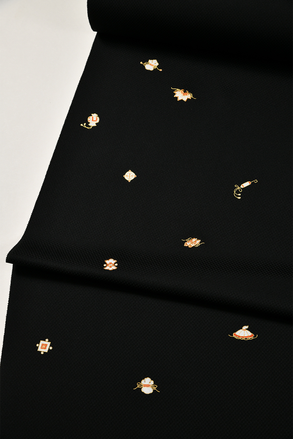 細かい市松模様の地紋のある黒地の生地に、白、金、朱赤の配色で、小さな宝尽くしの柄を散らしたお洒落な付下です。金彩の一部に金駒刺繍が施されているなど細部のこだわりと柄のサイズ感(あえて、絵柄がかなり小さめにデザインされています)が垢抜けた印象を与えます。写真2枚目では、千家十職塗師十三代中村宗哲監修のもと製作された大胆な笹蔓文様の袋帯を合わせて、大人の女性のコーディネートにしてみました。