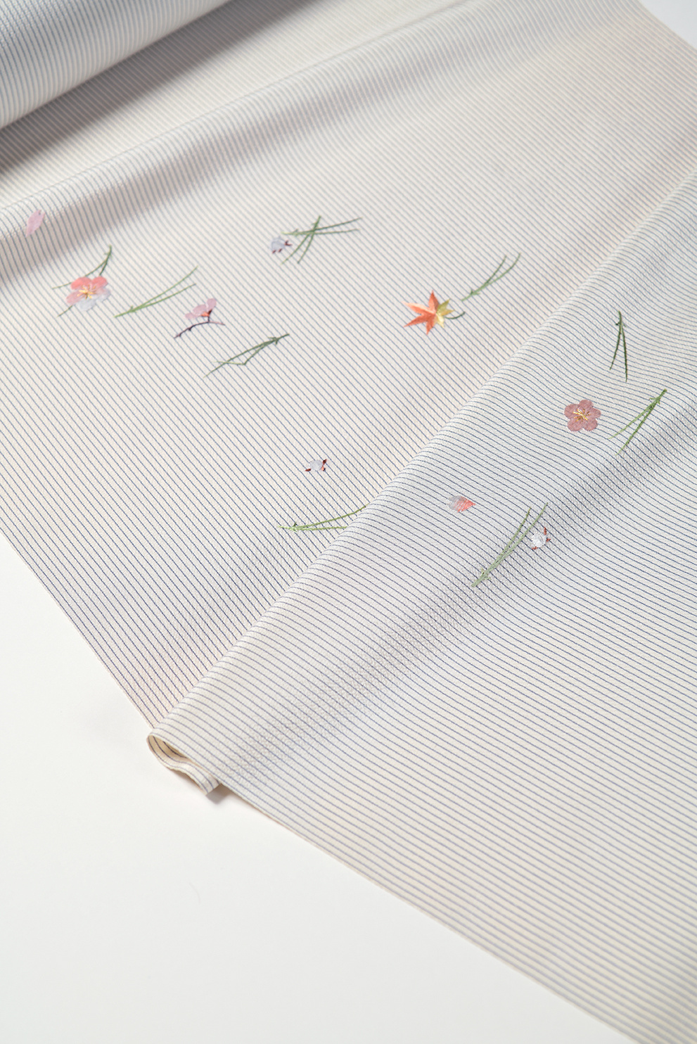 シャリ感のある縞の塩沢紬に吹き寄せ文様を手刺繍した付下です。さらりとした肌ざわりは単衣におすすめで、カジュアルなパーティーや趣味の会合などに最適です。次のシーズンに向けて、おしゃれな単衣向きのお着物も入荷が始まっておりますので、どうぞお気軽にお問い合わせください。