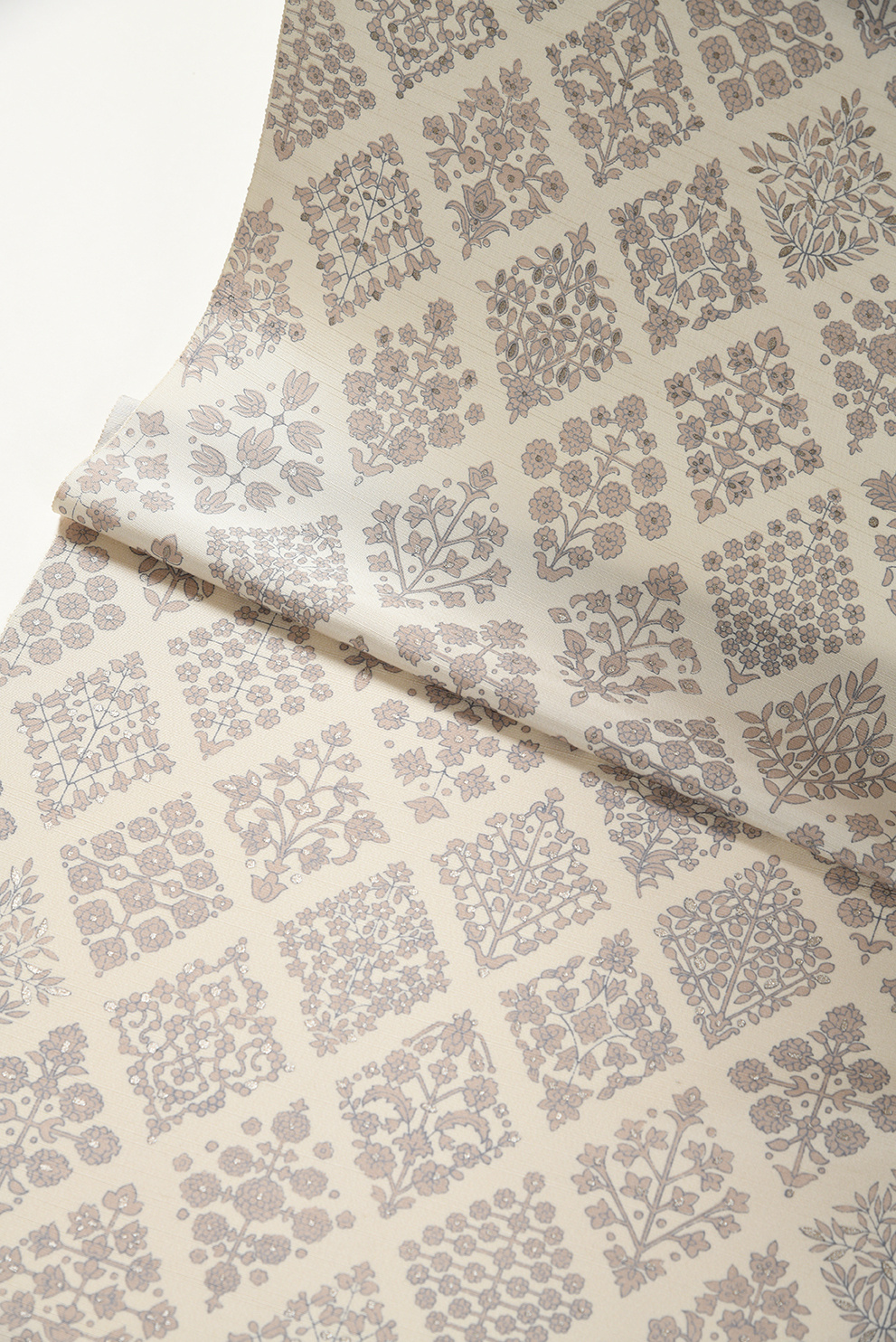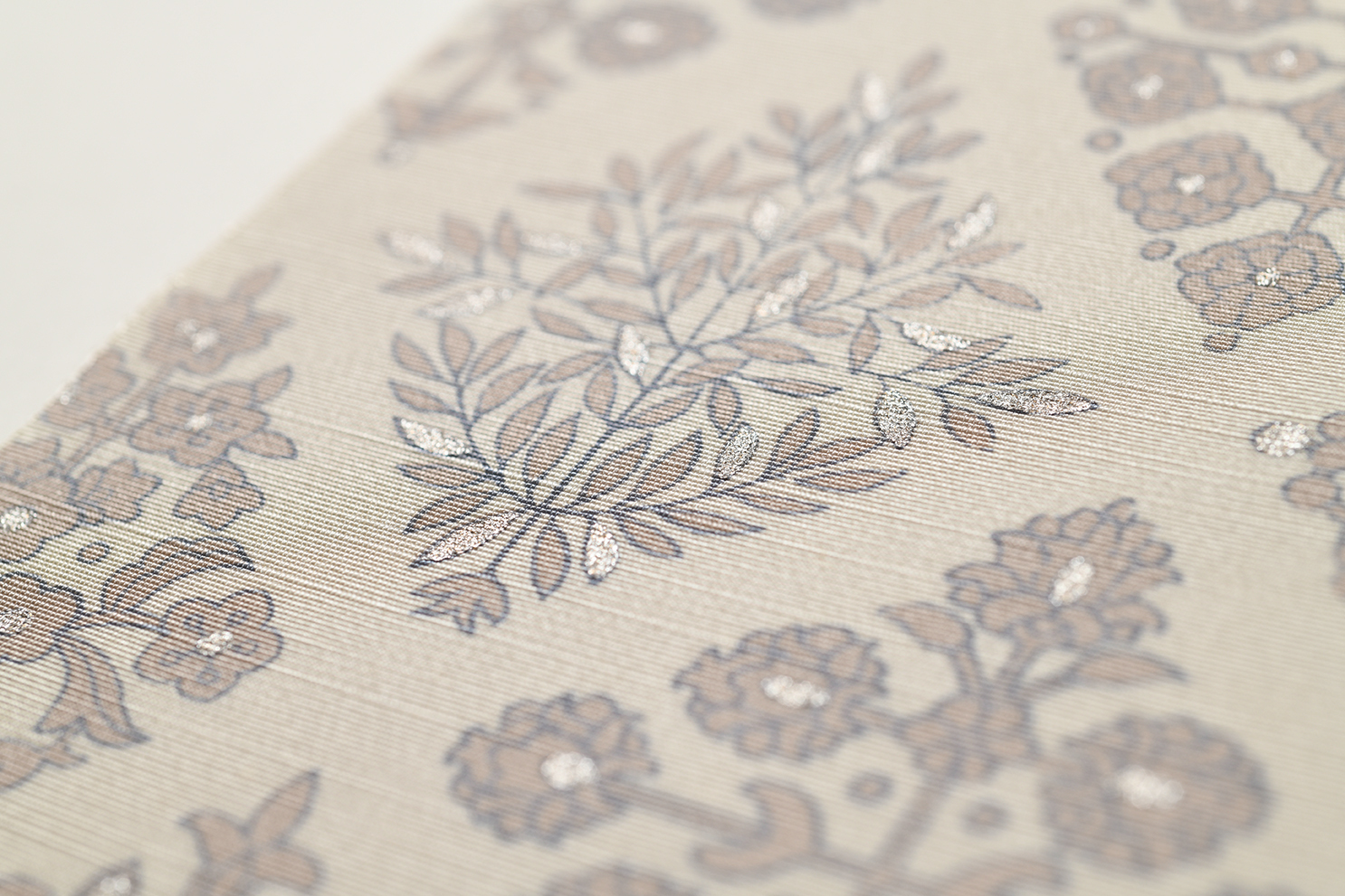 よく有りそうでなかなか出会えない、程よく華やかさを持ちながら控えめな雰囲気も感じさせるお洒落な大人の小紋です。お召しいただくと、光によって浮かび上がる絶妙な地紋の質感が素敵に映えるので、ぜひお顔に合わせてお試しいただきたいお品です。