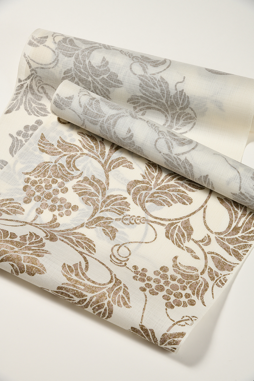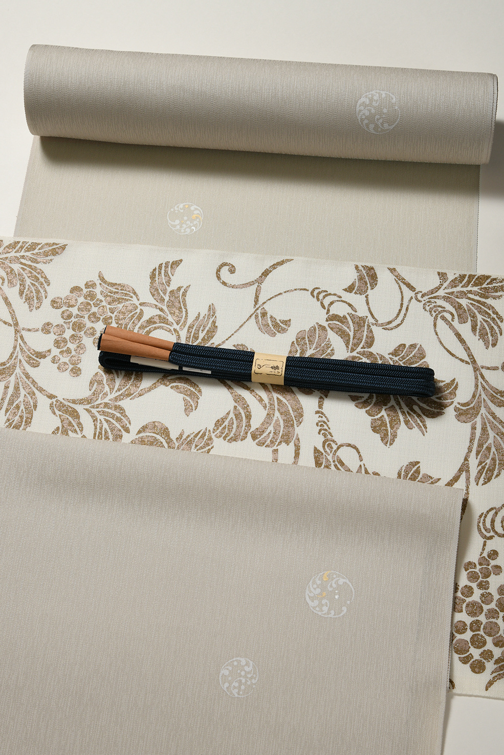 弊店で生地選びからこだわって制作した夏帯です。色味の異なる数種類の箔を重ねた味わいのある錆金箔でぶどう唐草が描かれています。合わせている着物は、透けすぎず単衣としてお召し頂けるとても涼しいフォーマル小紋です。これからの陽気に大変重宝する逸品です。小紋はお色違いで錆ブルーもございます。