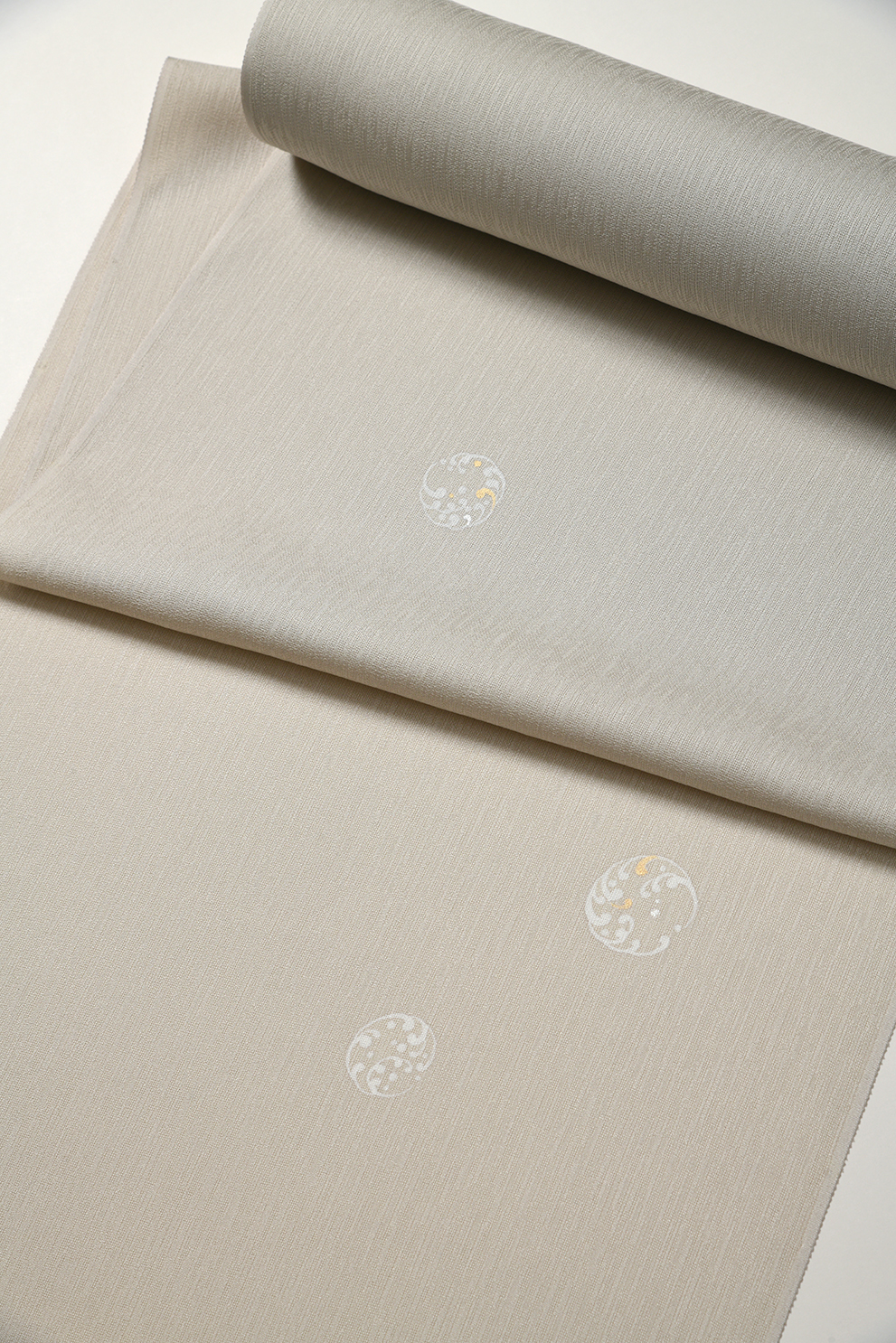 透け感を抑えつつも大変涼しい変わり生地の単衣向き付下です。実用性と美しい生地質を兼ね備えた、よく研究された一品です。モンゴル古裂に材をとったお洒落な夏袋帯を合わせてみました。付下の雪輪模様の中には細かな江戸小紋の柄(金彩の部分は青海波、彩の部分は七宝)の加工が施されています。
