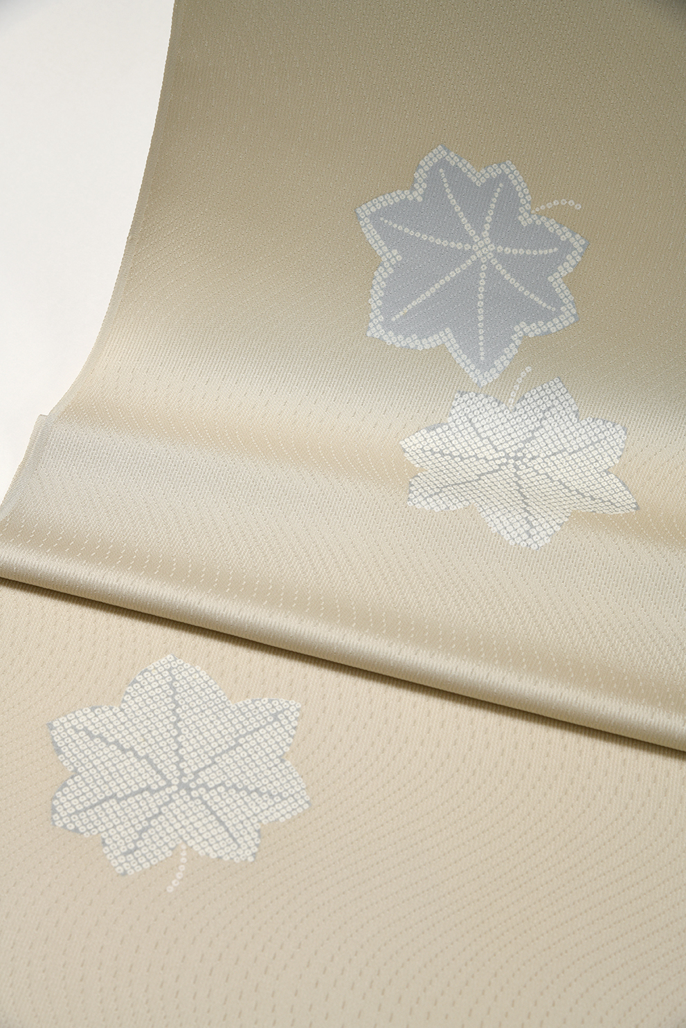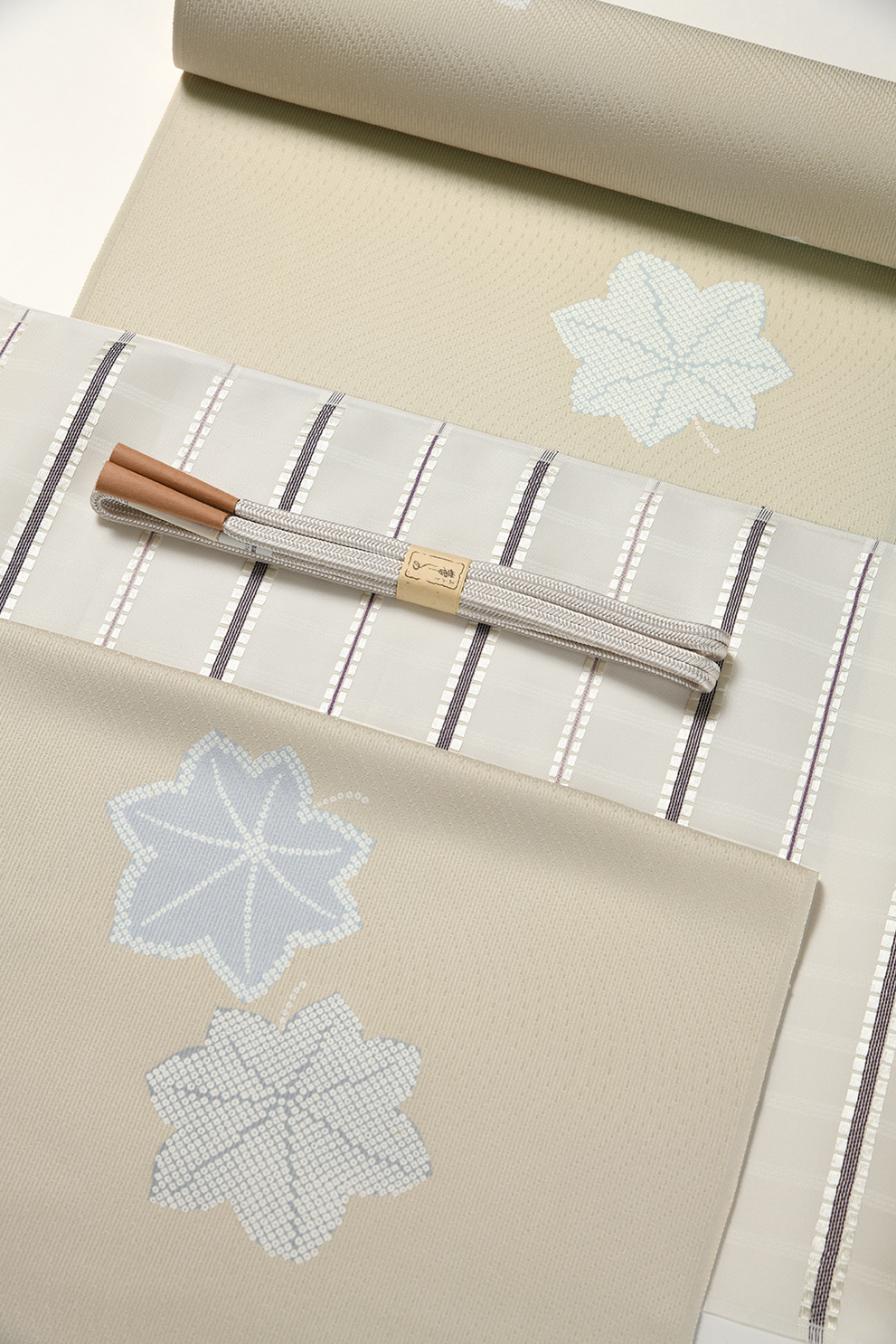 さらりとした単衣に最適な変わり生地に近代日本画のような匹田楓を染めたお洒落な小紋。古典の情緒と洗練されたモダンな雰囲気を合わせもつ美しいお着物です。日差しの強くなる時期をイメージして、スッキリとした間道柄の夏帯を合わせました。